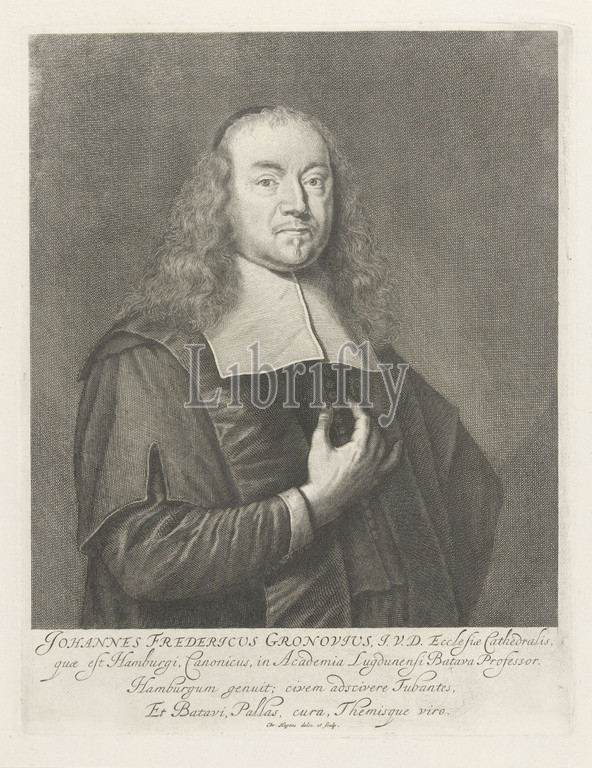 Portrait, Johannes Fredericus Gronovius, Half-length portrait, right, writer Johannes Fredericus Gronovius, under, portrait, four-line text, Latin, mustache, Johann Friedrich Gronovius, Christiaan Hagen, mentioned, object, Amsterdam, c, 1635, 1695, paper, engraving, w 282 mm × h 218 mm