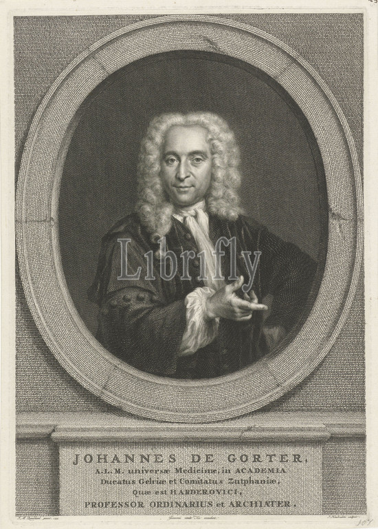 Portrait, Johannes de Gorter Johannes de Gorter, title, object, Half-length portrait, Johannes de Gorter, oval, portrait rests, ledge, name, information, five lines, Latin, Jacob Houbraken, mentioned, Leiden, 1735, 1747, paper, engraving