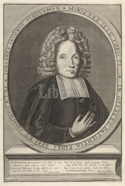 Portrait, Johannes Jacobus Schuurman, Portrait bust, pastor, Kleef, age, 41, image, eight-line verse, two columns, wedge, G, de Koningh, mentioned, object, 1675, 1724, paper, engraving