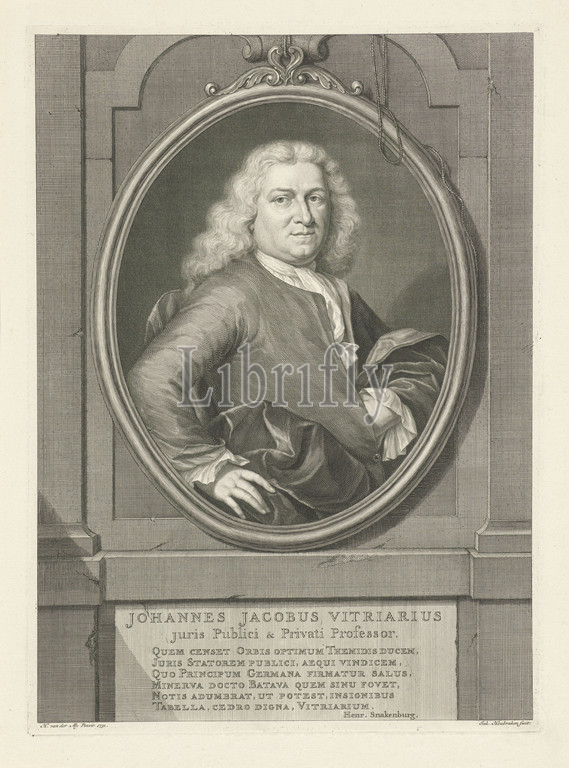 Portrait of Johannes Jacobus Vitriarius Johannes Jacobus Vitriarius (title on object), Half-length portrait to the right of Johannes Jacobus Vitriarius in an oval medallion, against an architectural wall and resting on a ledge. Below the portrait a plaque on which the name and details of the person portrayed in two lines in Latin and a six-line verse in Latin., Jacob Houbraken (mentioned on object), Amsterdam, 1731 - 1780, paper, engraving, h 380 mm × w 275 mm
