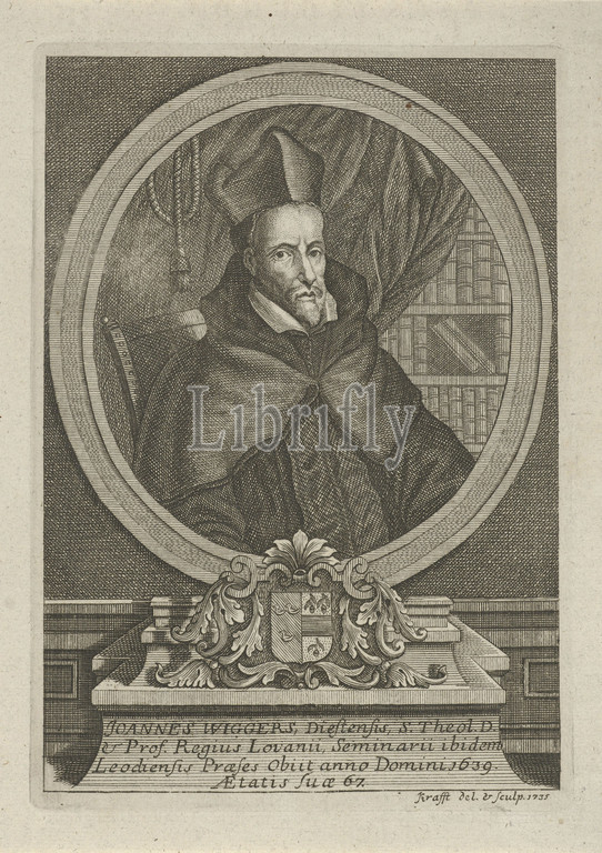 Portrait, Johannes Wiggers, Portrait bust, Leuven professor, theology Johannes Wiggers, study, Under, portrait, name, titles, dates, life, Latin, Joannes Wiggers, Jan Lauwryn Krafft, I, mentioned, object, Southern Netherlands, 1735, paper, engraving