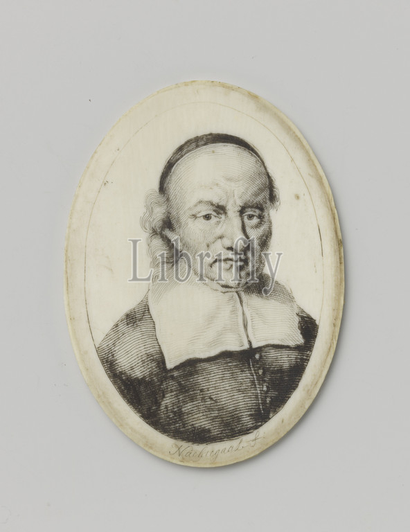 Portrait of Joost van den Vondel (1587-1679) on ivory, Oval thin disk of ivory with the bust of a man drawn in pen. Signed under drawing 'Nightingale f' and on the back with 'Nightingale fecit'. The portrait is that of an old man with a skullcap and a square collar. This portrait was originally in a double frame with that of Const. Huijgens. Netherlands, Joost van den Vondel, Clemens Nachtegaal, Netherlands, 1600 - 1699, ivory, h 9.1 cm × w 6.6 cm