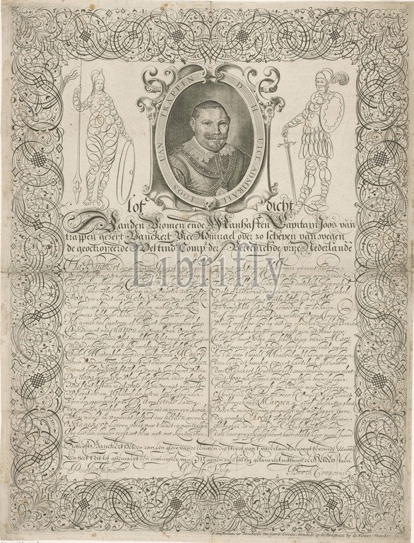 Portrait, Joost van Trappen Banckers, praise, Vice Admiral, Zeeland, Received, necklace, medallion, States General, Battle, Duins, 1639, calligraphed Dutch poem, two columns, Johannes Looff, mentioned, object, Amsterdam, 1686, paper, engraving