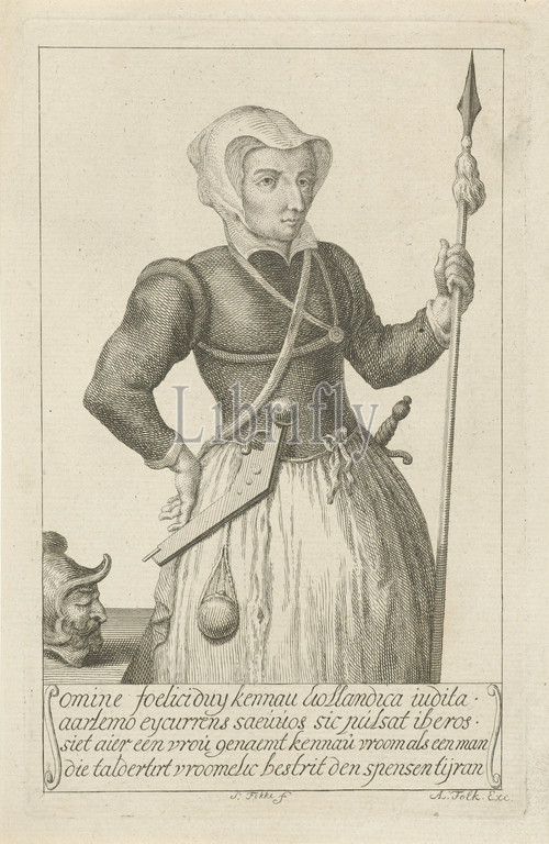 Portrait of Kenau Simonsdochter Hasselaar, Portrait halfway, to the right, of Kenau Simonsdochter Hasselaar. In her right hand she carries a spear. On the left the sheet of a table on which the head of a Spaniard lies. Below the image is a four-line text., Historical persons - BB - woman, Kenau Simonsdochter Hasselaer, Simon Fokke (mentioned on object), Amsterdam, 1722 - 1784, paper, engraving, h 179 mm × w 113 mm