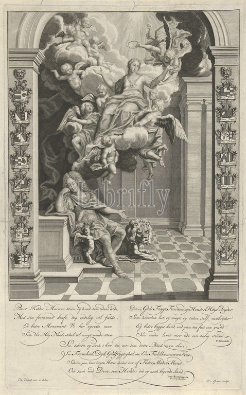Portrait of a King Frederick IV of Denmark, Frederick IV, King of Denmark, leaning against his throne. A lion at his feet. Upstairs his wife, Queen Louise of Mecklenburg, is carried to heaven by angels and crowned with a laurel wreath. Eight coats of arms of Danish cities on either side of the show. The print has a Danish signature in rhyme., Pieter van Gunst (mentioned on object), Amsterdam, 1659 - c. 1731, paper, engraving, h 482 mm × w 297 mm