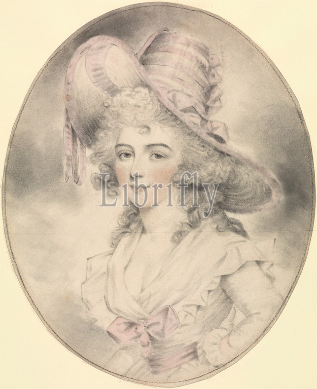 Portrait, Lady, Facing Left, John Downman, 1750–1824, British, Black, red chalk, watercolor, stumping, medium, smooth, blued white wove paper, Sheet, bow, costume accessory, curls, figure study, gown, hat, lady, nobility, oval, portrait, ribbon, ruffles, woman