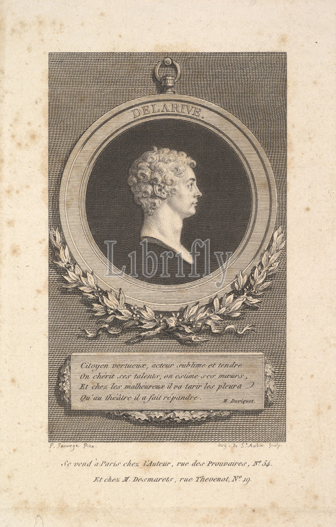 Portrait, De Larive, 1785, Etching, engraving, sixth state, seven, Bocher, Sheet, 6 9/16, 4 3/16, 16.7, 10.7 cm, Prints, Augustin de Saint-Aubin, French, Paris, 1736–1807, According, Bocher catalogue, Mercure France, January 1786, portrait upon, print, based, M, Sauvage, whereas, inscription reads, P