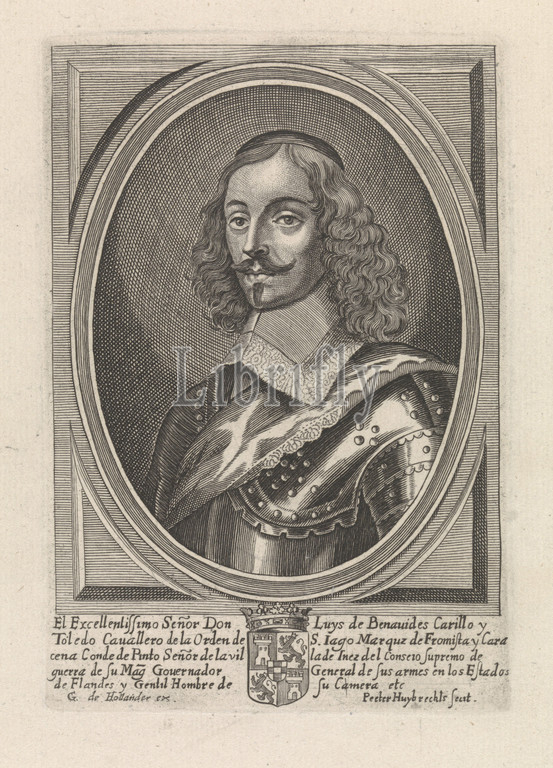 Portrait, Luis de Benavides Carillo, Bust, left, oval, middle under, weapon, five-line text, Spanish, Peeter Huybrechts, mentioned, object, Antwerp, 1635, 1653, paper, engraving