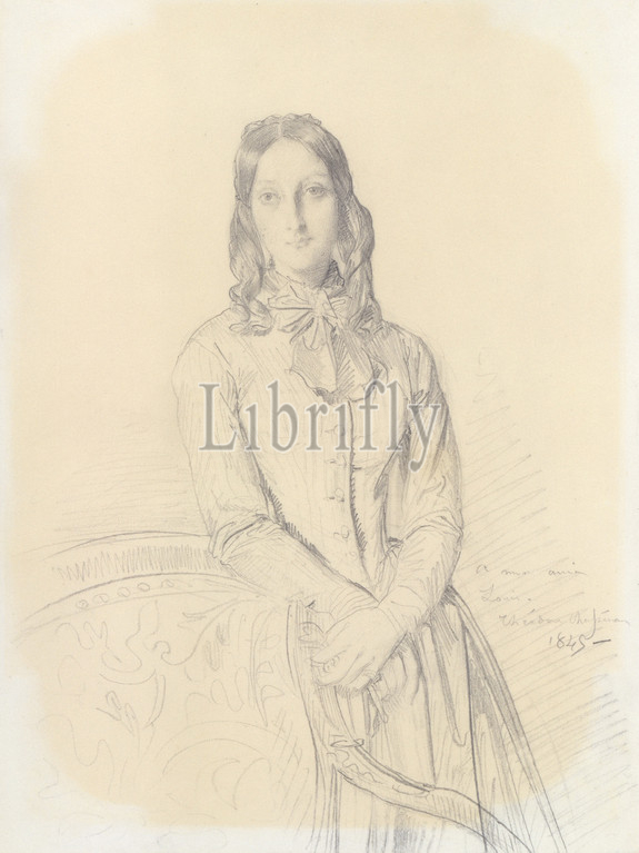 Portrait of Madame Gabrielle Marcotte de Quivières, 1845, Graphite on white wove paper darkened to buff, mounted on stiff paper, 12 13/16 x 10 3/4 in. (32.5 x 27.3 cm); Rabbet: 22 x 16 in. (55.9 x 40.6 cm.); Overall Frame: H x W x D: 18 x 24 x 1 1/4 in. (45.7 x 61 x 3.2 cm.), Drawings, Théodore Chassériau (French, Le Limon, Saint-Domingue, West Indies 1819–1856 Paris), In 1845 Chassériau was asked to make a portrait drawing of his friend Louis Marcotte de Quivières, a young aristocrat who collected paintings by Ingres. Chassériau also sketched this portrait of Marcotte de Quivières’s wife, Gabrielle
