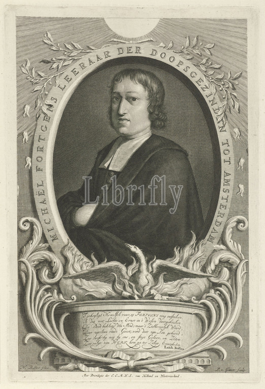 Portrait, Michael Fortgens, Amsterdam pastor, teacher, Mennonite congregation, portrait, phoenix, Dutch poem, life, Story, Phoenix, Pieter van Gunst, mentioned, object, Amsterdam, 1695, 1731, paper, engraving, w 180 mm × h 269 mm