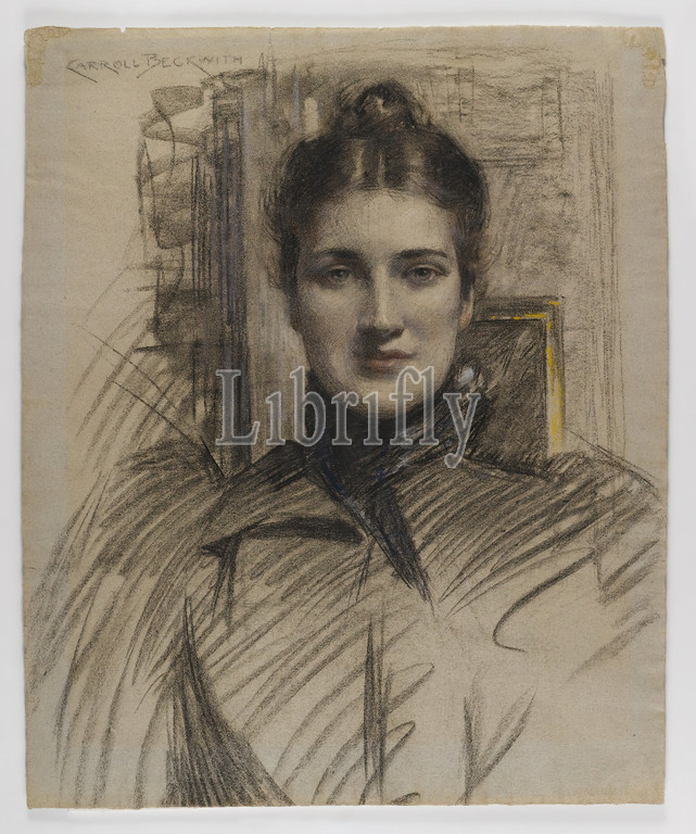 Portrait of Minnie Clark, J. Carroll Beckwith, American, 1852-1917, Charcoal and pastel on blue-fibered, medium-weight, moderately textured laid paper, ca. 1890s, Sheet: 22 3/8 x 18 1/4 in., 56.8 x 46.4 cm, bun, charcoal, drawing, face, female, female beauty, fine lines, hairstyle, portrait, woman