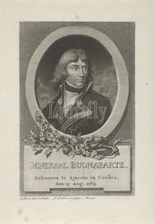 Portrait, Napoleon I Bonaparte, Bust Portrait, Emperor, French, portrait, set, oval frame, oak leaves underneath, context, name, person portrayed, two-line caption, Dutch, Christiaan Josi, mentioned, object, Noord-Nederland, 1784, 1828, paper, engraving