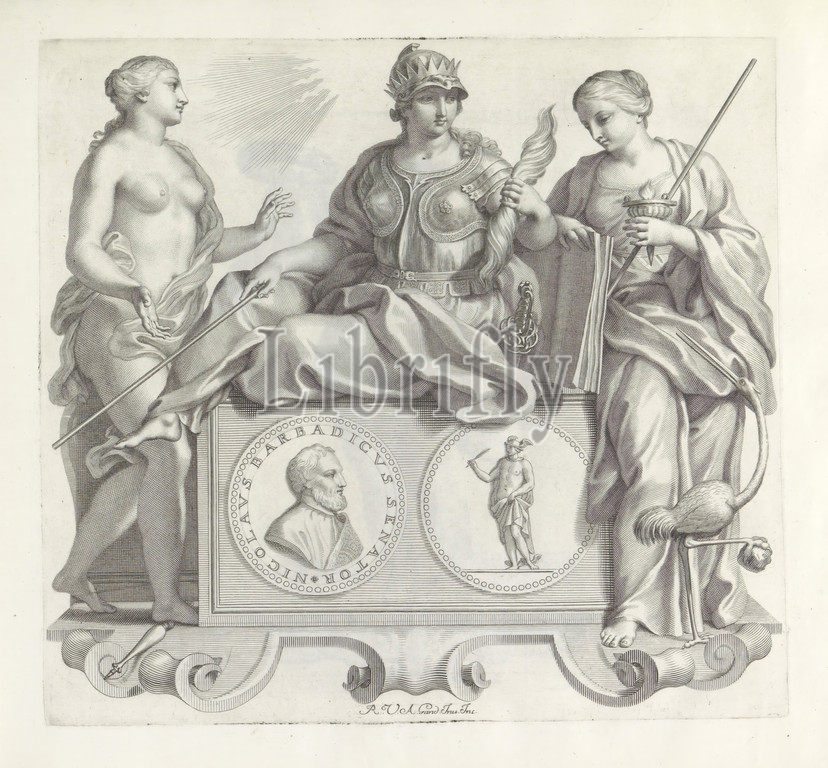 Portrait, Nicolo Barbarigo, personifications, eloquence, truth, vigilance Numismata virorum illustrium ex Barbadica gente, series title, Pedestal, form, cartouche, top, medallion, front, portrait, senator Nicolo Barbarigo, back Mercury, writing spring, hand, pedestal, personification, Eloquence, woman, helmet, head, crown, rod, lightning bolt, hands, rapier beside, assisted, Truth, Vigilance, naked woman, face turned, rays, heaven, standing, scepter, hands free, Vigilance involves, book, torch, crane, leg pulled up, feet, stone, claw, print, part, album, medal, considered, piece, sculpture, regardless, specific function, story, Minerva, Pallas, Athena, Mercury, Hermes, Alertness, Guardia, 'Vigilanza, difendersi & oppugnare altri ', Ripa, Eloquenza, Fermezza & Gravità dell'Oratione ', Wisdom, Sapienza, Sapienza humana, Sapienza vera, Robert van Audenaerd, mentioned, object, Rome, 1673, 1743, paper, engraving