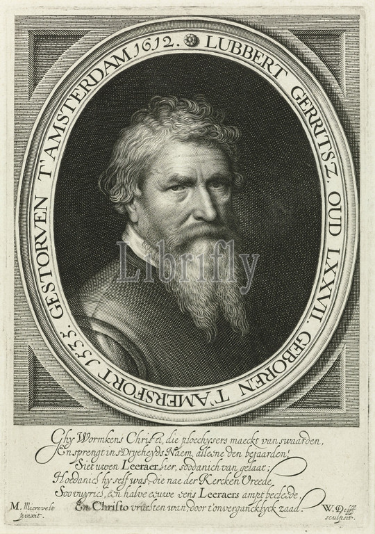 Portrait, pastor Lubbert Gerritsz, Bust, two-pointed beard, oval frame, Under Dutch margin, six lines, Theologian, Lubbert Gerrits, Willem Jacobsz, Delff, mentioned, object, Delft, 1612, paper, engraving