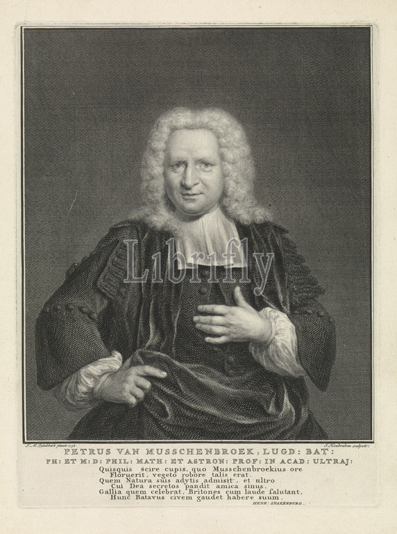 Portrait of Petrus van Musschenbroek Petrus van Musschenbroek (title on object), Half-length portrait of Petrus van Musschenbroek. Below the portrait are name and information in two lines in Latin and below that a six-line text in Latin, Petrus van Musschenbroek, Jacob Houbraken (mentioned on object), Amsterdam, 1738 - 1740, paper, engraving