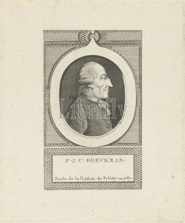 Portrait, P.J.C, Beeckman, Portrait bust, oval, counselor, Saint-Géry, Bareheads, profile, right, portrait, name, function, person portrayed, mentioned, French, J.F, De La Rue, 1787, paper, engraving