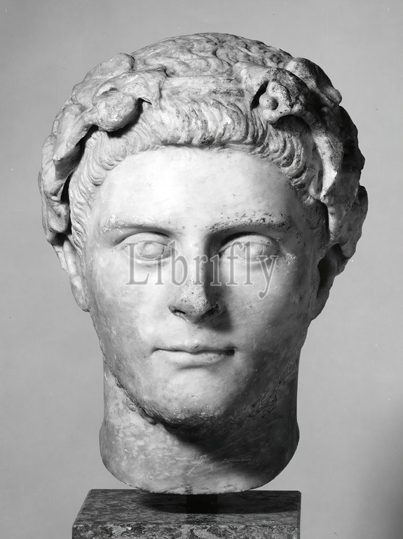 Portrait, Roman, Formerly Johannes W, F, Collection Reimers, Hamburg, Marble, chiseled, drilled, smoothed, marble, Depth, Sculptures, Three-dimensional sculptures, Man, Head, Face, Head image, Hair curl, tuft, strand, Hair fashion, Hair fashion, Wreath, Garland, Portrait, Priest, Soldier Emperor, Roman Antiquity, portrait formerly, bust, statue, antique break, neck, worked off, modern way, surface, allow, better base, face must, cleaned, acid, recent times, hair, wreath, left, state, reddish-brown earth deposits, visible, contrast, specky-glossy face, dull hair, wreath leaves results, different treatment, Depicted, man, younger age, throat beard, beard costume, particularly well, portraits, Roman emperor Gallienus, reigned 253-268 AD, portrait, man shown, belongs, years, ivy wreath, hair seems, indicate, connection, wine god Dionysos, lat, Bacchus, attributes include ivy, vine wreaths, high sculptural quality, head, particularly expressed, naturalistic formation, wreath leaves, elaboration, portrait becomes, summary towards, back, concluded, portrait, originally placed, front, wall, niche, rear view, hidden, viewer