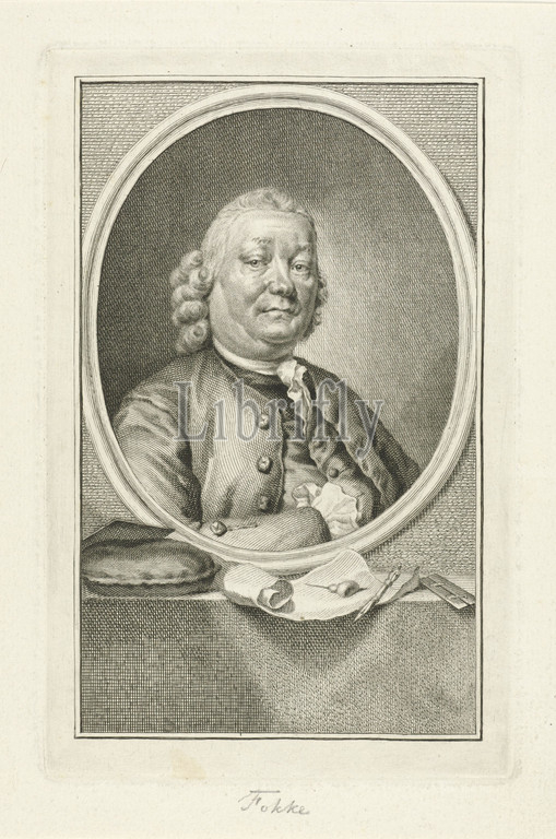 Portrait, Simon Fokke, engraver Simon Fokke, oval, portrait rests, plinth, engraver's tools, burin, etching needle, paper, tools, implements, graphic artist, Jacob Houbraken, Amsterdam, 1773, engraving