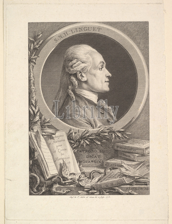Portrait of Simon-Nicolas-Henri Linguet, 1773, Etching and engraving; fourth state of five (Bocher), Sheet: 9 13/16 × 6 5/8 in. (25 × 16.8 cm), Augustin de Saint-Aubin (French, Paris 1736–1807 Paris), Ornament designed by Pierre Philippe Choffard (French, Paris 1730–1809 Paris)