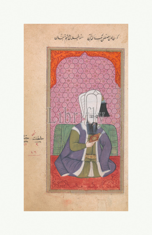 Portrait, Sultan Mustafa I, r, 1617–18, 1622–23, late 17th–early 18th century, Attributed, Turkey, Opaque watercolor, paper, H, 6 1/2, 16.5 cm, Codices, no, pictures, Mustafa painted, lifetime, small image, part, later tradition, depicting, Ottoman sultans, series, Contemporary written descriptions, sultan state, ‘ small, attractive face, pale complexion, sorrowful expression, sparse beard, large black, eyes’