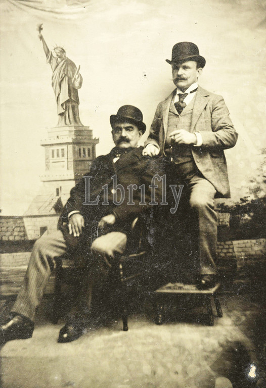 Portrait of two men for a painted backdrop with the Statue of Liberty in New York, USA, Anonymous, c. 1890