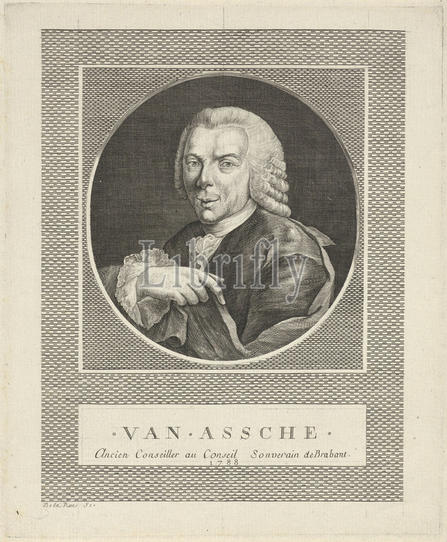 Portrait, F.J, van Assche, Portrait bust, left, former councilor, Supreme Court, Brabant, bareheaded, portrait, framed, circular frame, bottom provided, name, function, person portrayed, French, J.F, De La Rue, mentioned, object, 1788, paper, engraving