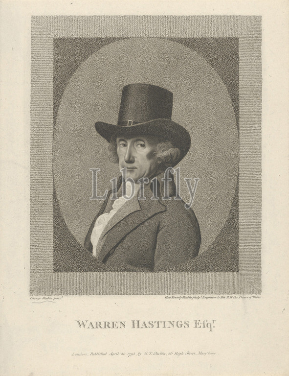 Portrait of Warren Hastings, Esq., April 30, 1795, Stipple engraving, image: 6 5/8 x 5 1/2 in. (16.8 x 14 cm), Prints, George Townley Stubbs (British, Liverpool 1756–1815), After George Stubbs (British, Liverpool 1724–1806 London)