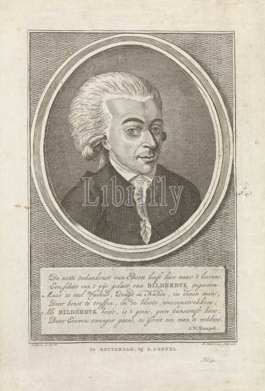 Portrait, Willem Bilderdijk, Buste, right, oval, 6-line text, Dutch, Joannes Hulstkamp, mentioned, object, Rotterdam, 1786, paper, engraving