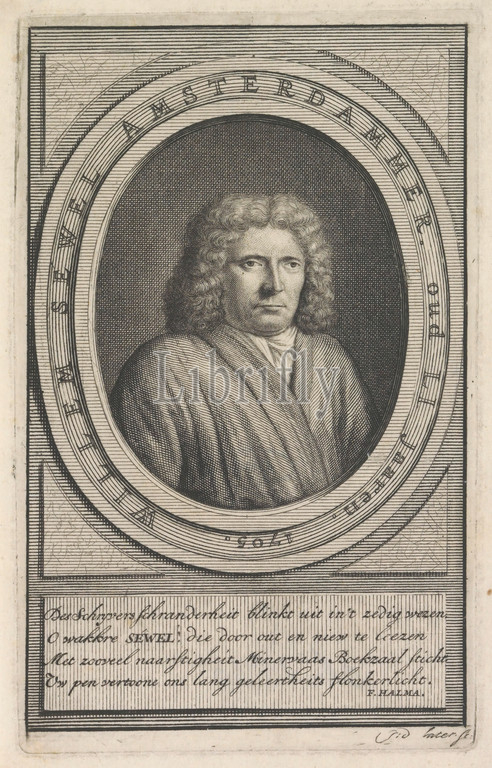 Portrait, Willem Sewel, Portrait bust, oval, right, linguist, Around, portrait, edge lettering, underneath, plaque, four-line verse, Dutch, Jacob de Later, mentioned, object, 1705, paper, engraving