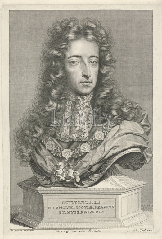 Portrait, William III, Prince, Orange-Nassau, King, England, Bust, bears, order mark, Garter, knighthood order, Orange, Scotland, Ireland, Pieter van Gunst, mentioned, object, Amsterdam, 1689, 1731, paper, engraving, w 238 mm × h 336 mm