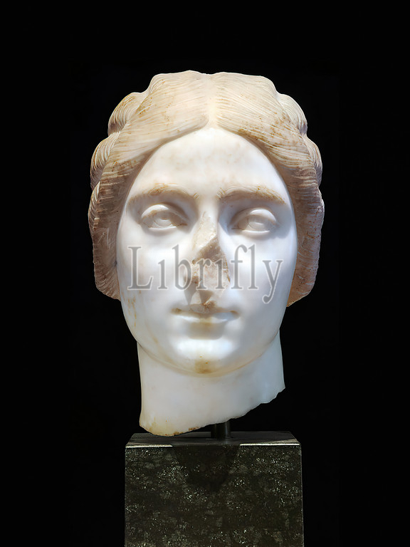 Portrait, young Roman woman, marble, chiseled, marble, Depth, sculptures, three-dimensional sculptures, portrait, head, face, Bruttia Crispina, Middle Imperial Period, Commodus, Septimius Severus, Roman Antiquity, delicately moving face, porcelain-, smoothness contrasts, rough surface, hair sections, contrast, main attractions, qualitatively excellent head, of, cannot, said, certainty whether, part, statue, bust, characteristic hairstyle, central parting, hair waves, sides, radial bun, knot, back, head, led, interpretation, Bruttia Crispina, married, Commodus, later emperor, seventeen years old, 178 AD, winter 182, connected, conspiracy, Commodus, banished, Capri, executed, question, whether, portrait, member, imperial family, private portrait, preserved, complicated, fact, on, hand, free-standing sculptural portraits, Crispina, generally accepted, authentic and, on, hand, adoption, imperial hairstyles, private individuals, widespread