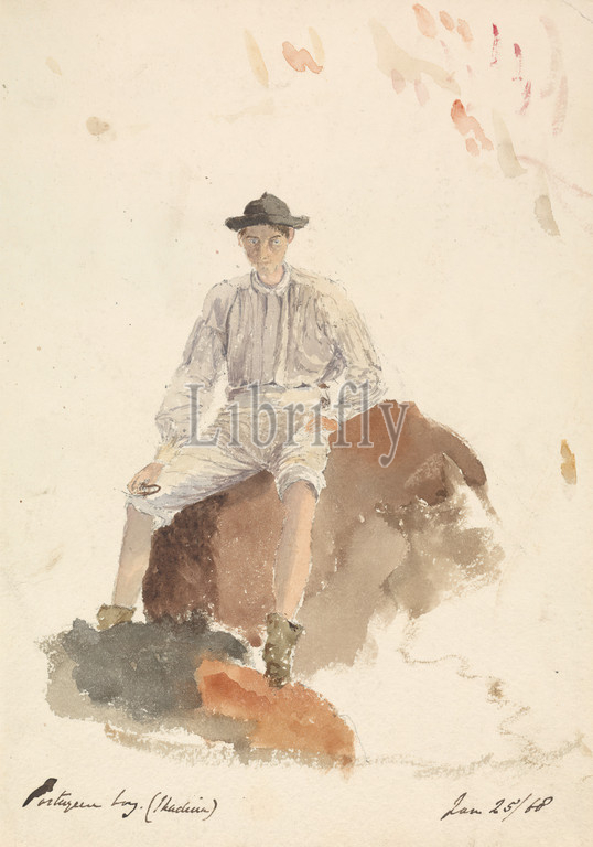 Portuguese Boy (Madeira) January 25, 1868, unknown artist, 1868, Watercolor and graphite on thick, moderately textured, cream wove paper, Sheet: 10 × 7 inches (25.4 × 17.8 cm), boy, genre subject, hat, portrait, rocks (landforms), Madeira, Portugal