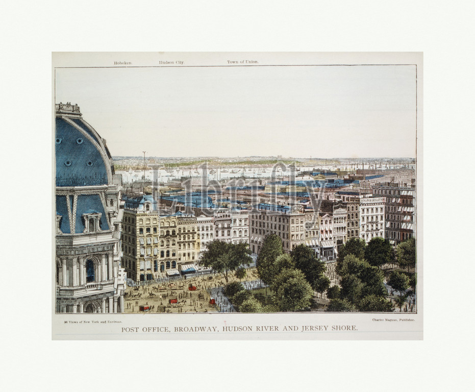 Post Office, Broadway, Hudson River and Jersey Shore, after 1878, Wood engraving, hand colored, 11 x 8 1/2 in. (27.9 x 21.6 cm), Prints