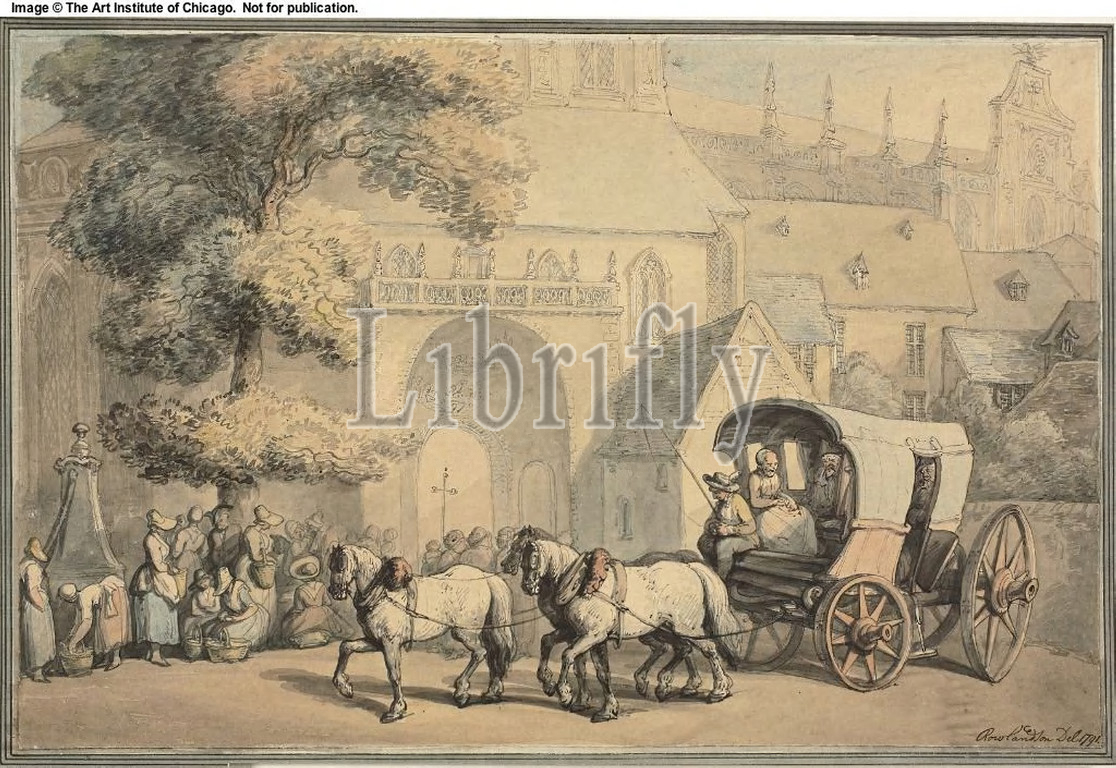 Postcart Monks, Women, Church Door, 1791, Thomas Rowlandson, English, 1756-1827, England, Pen, gray, brown ink, brush, watercolor, traces, graphite, tan wove paper, laid down, card, 250