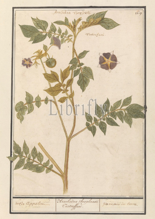 Potato, Solanum tuberosum, aerde apples, Arachidna theophrasti Tartouffani, pommes de terre, title, object, another plant, nightshade family, Branch, leaves, purple, flowers, seed fruit, Numbered top right, 169, top two Latin names, Part, second album, drawings, plants, Ninth, twelve albums, animals, birds, 1600, commissioned, Emperor Rudolf II, explanation, Dutch, Latin, French, potatoes, plants cultivated, edible roots, tubers, eg potato, turnip, Anselmus Boetius de Boodt, 1596, 1610, paper, watercolor, paint, deck paint, chalk, ink, pen