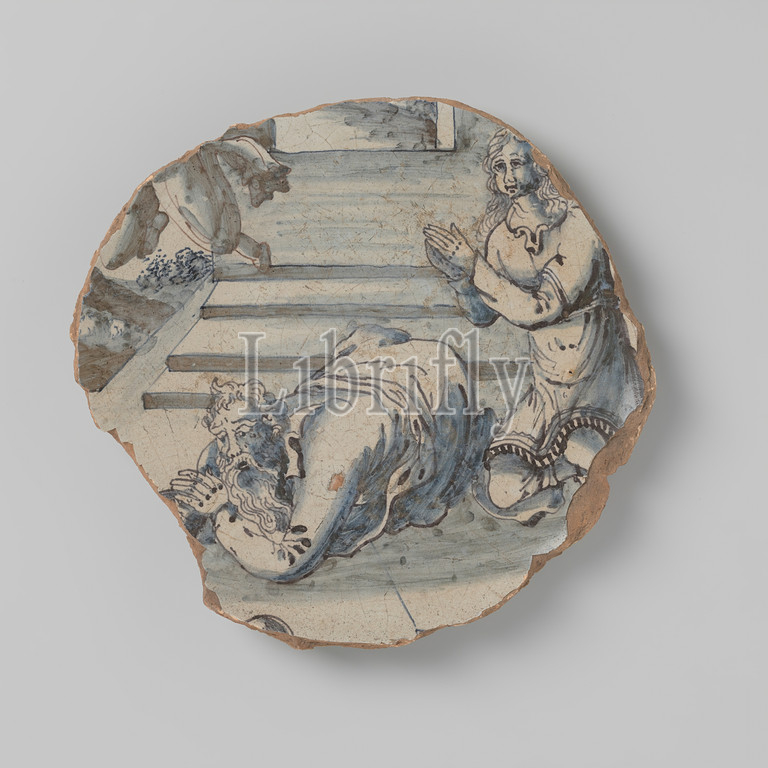 Pottery shrapnel, drawing, three figures, staircase, underglaze blue, Manoah's sacrifice, 1500, 1799, earthenware, glaze