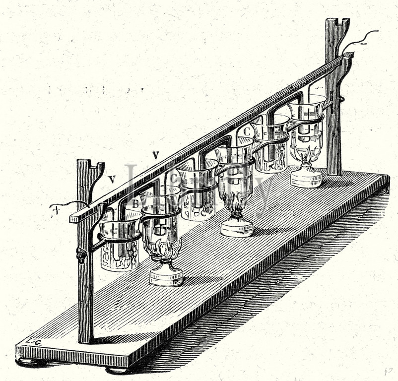 m. pouillet, pouillet, thermopile, experiment, scientific, 19th century engraving, invention, age of enlightenment, science, blaze, fire, vintage, old print, 19th century, victorian, retro, quint, lox, engraving