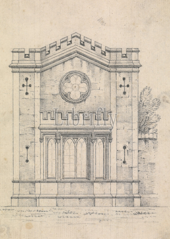 Preparatory drawing for Design 19, Plate 31 of A Collection of Designs for Rural Rereats, James Malton, 1761–1803, British, 1802, Graphite on medium, slightly textured, cream wove paper, Sheet: 4 × 3 1/2 inches (10.2 × 8.9 cm), Architectural design, Architectural rendering, architectural subject, building, cottage, country house, crenelations, design drawing, Gothic architectural decoration, Gothic architectural drawing, Gothic architecture, Gothic Revival, lancet windows, lancets, mullions, preparatory drawing, quatrefoil, rose window, stonework, windows