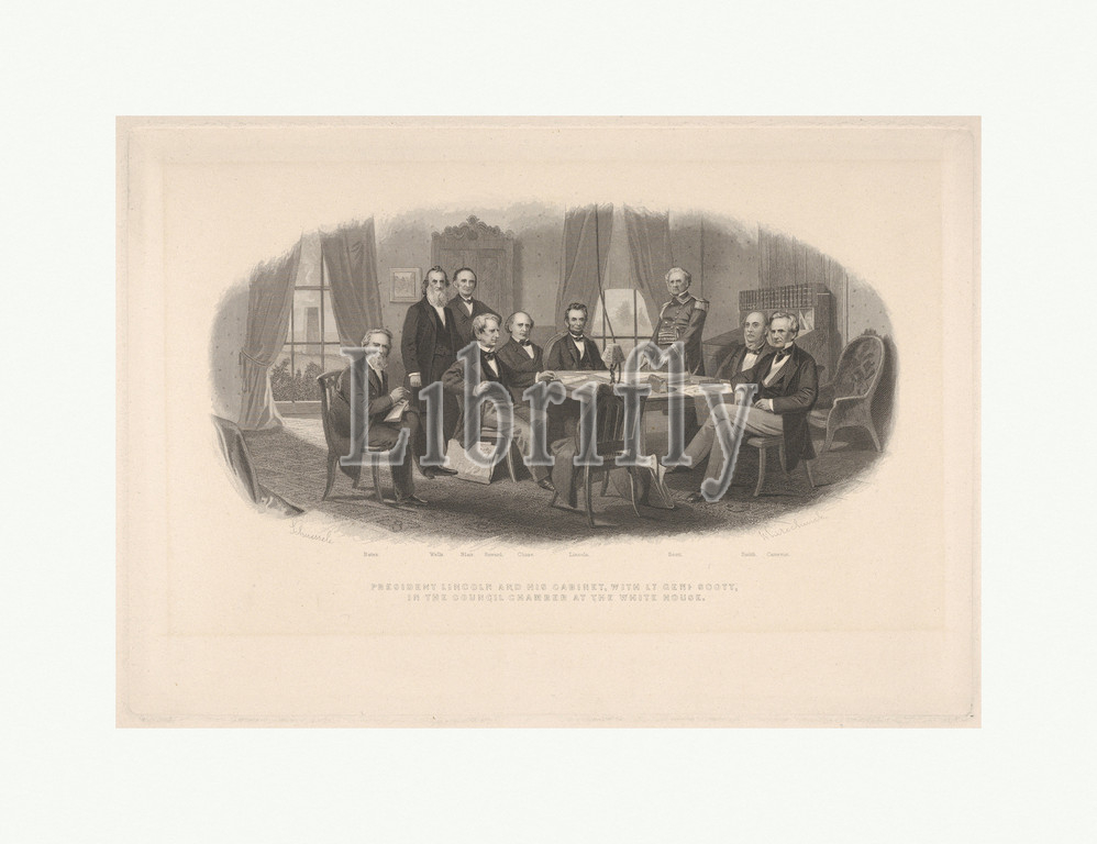 President Lincoln and His Cabinet, with Lt. General Scott, in the Council Chamber at the White House, ca. 1861, Etching, engraving and stipple, Plate: 6 7/8 × 9 7/8 in. (17.5 × 25.1 cm), Prints, After Christian Schussele (American (born France), Guebwiller 1824–1879 Merchantville, New Jersey), Based on a drawing, Schussele’s print documents Lincoln's chier advisors early in the Civil War. Pictured from left to right are Edward Bates (Attorney General), Gideon Welles (Secretary of the Navy), Montgomery Blair (Postmaster General), William Henry Seward (Secretary of State), Salmon Portland Chase (Secretary of the Treasury), the President, General Winfield Scott (Chief of the Army), Caleb Blood Smith (Secretary of the Interior), and Simon Cameron (Secretary of War)