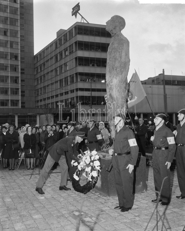 Prince Bernhard lays a wreath after the unveiling of the resistance monument 'Unbroken Resistance'. The statue is located at the Westersingel in Rotterdam, May 4, 1965, wreath laying, unveilings, war memorials, resistance, The Netherlands, 20th century press agency photo, news to remember, documentary, historic photography 1945-1990, visual stories, human history of the Twentieth Century, capturing moments in time