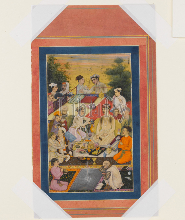 'Prince Feasting on a Balcony', Folio from the Davis Album, late 17th–early 18th century, Attributed to India, Ink, opaque watercolor, and gold on paper, Page: H. 13 1/8 in. (33.3 cm), Codices, Paintings of the mid-seventeenth century depict the private life of the court, illustrating the quiet moments of the emperors, queens, princes, and princesses in a manner very different from their formal portraits