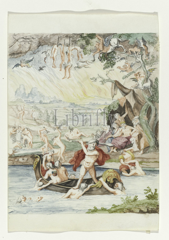 Prince Maurits 'crossing in Charons boat Oldenbarnevelt's Regtlegleg (series title), cartoon on which Prince Maurits' crossing in Charons (= Prince William II) boat. People here. Also some drowning people in the water. A few people were hung from a tree branch. A few people watch from the quay. Related handwritten text. Associated with series of watercolors in book, Johan van Oldenbarnevelt, Maurits (Prince of Orange), Willem II (Prince of Orange), anonymous, Netherlands, 1708 - 1795, parchment (animal material), watercolor (paint), ink, pen, h 23.5 cm × w 19 cm