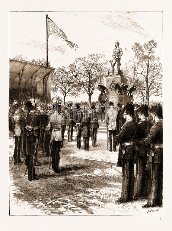 PRINCE, WALES, UNVEILING, COUNT, GLEICHEN'S, STATUE, IMPERIAL, GROUNDS, ROYAL, MILITARY, ACADEMY, WOOLWICH, UK, 1883, 19th century engraving, engraved image, history, illustrative technique, engravement, engraving, victorian, Arts, Culture, 19th Century Style, Retro Styled, Vintage, retro, arkheia, nineteenth century engraving