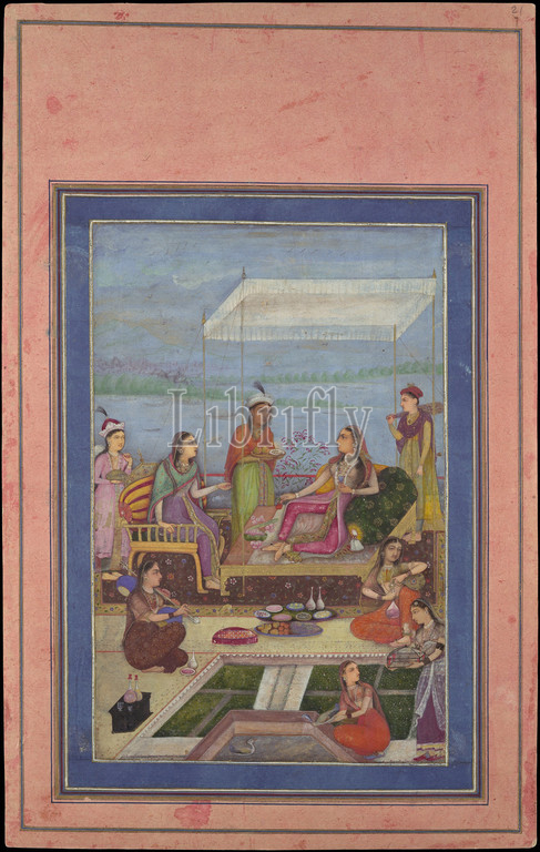 Princess Entertaining, Visitor, Balcony, Folio, Davis Album, mid–second half 17th century, Attributed, India, Ink, opaque watercolor, gold, paper, Page, H, 13 1/8, 33.3 cm, Codices, Mughal paintings, seventeenth, depict, private life, court, illustrating, quiet moments, emperors, queens, princes, princesses, manner, different, formal portraits