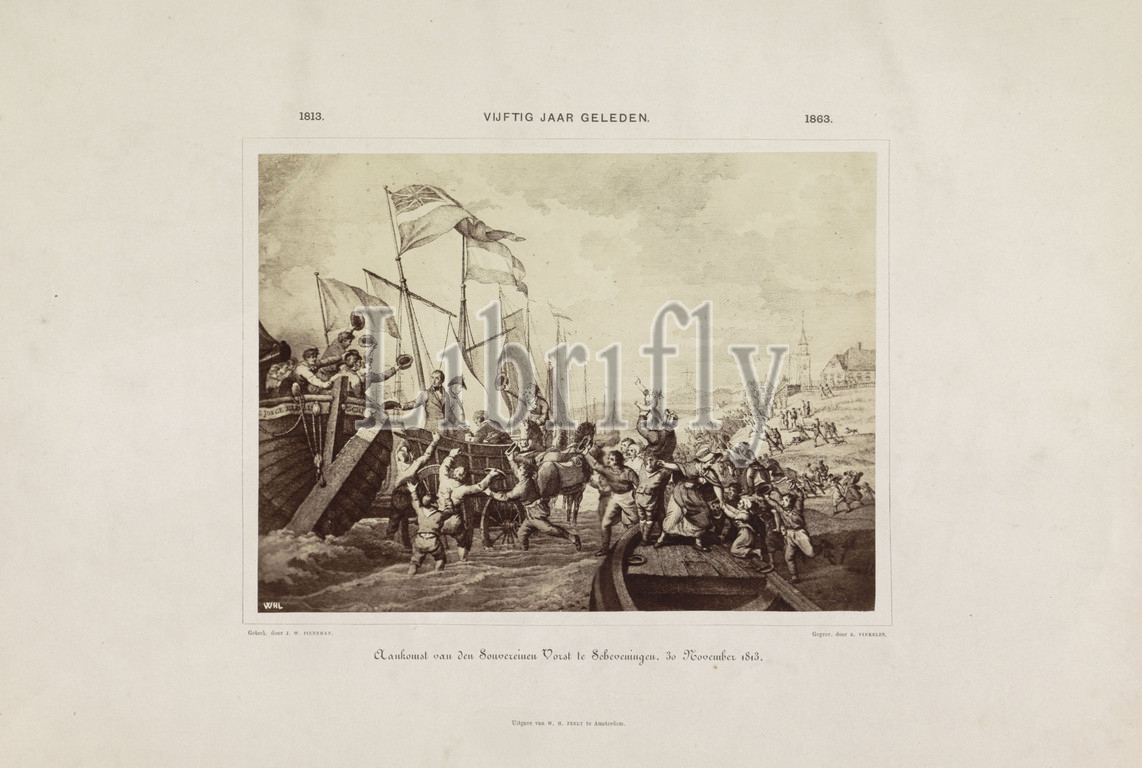 Print of the arrival of King William I at Scheveningen, 18131813. Fifty years ago. 1863., Arrival of the Sovereign Prince at Scheveningen. 30 November 1813. (title on object), Photoreproduction of the coloured print by R. Vinkeles after a drawing by J.W. Pieneman of the arrival of the sovereign in Scheveningen on 30 November. On the occasion of the fiftieth anniversary of Dutch independence., WHL (mentioned on object), publisher: W.H. Zeelt (mentioned on object), Netherlands, publisher: Amsterdam, 1863, paper, albumen print, height 169 mm × width 227 mmheight 318 mm × width 475 mm