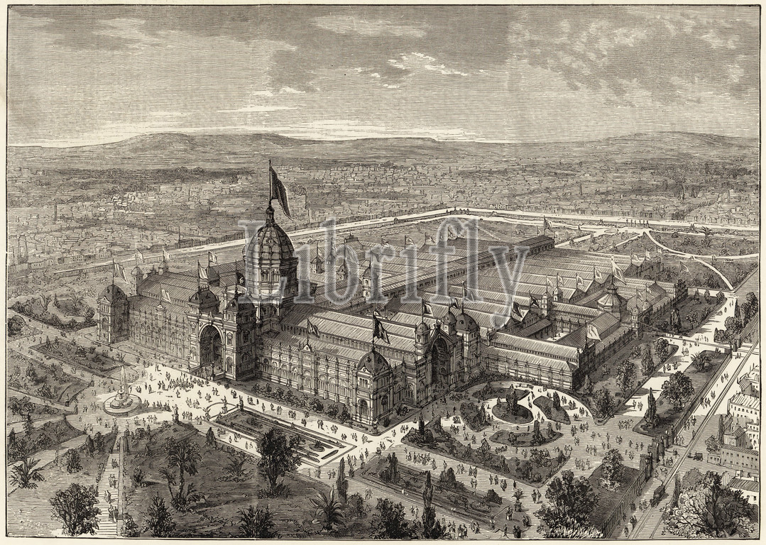 Print, International Exhibition Building, Melbourne, Australia, Illustrated London News, 14 Feb 1880, Black, white wood block engraving, titled' International Exhibition Building, printed, page 164, 14 February, 1880, image presents, aerial view, Exhibition Building, temporary annexes & gardens, south easterly aspect, Numerous people, depicted approaching, building via foot, horse-drawn trams