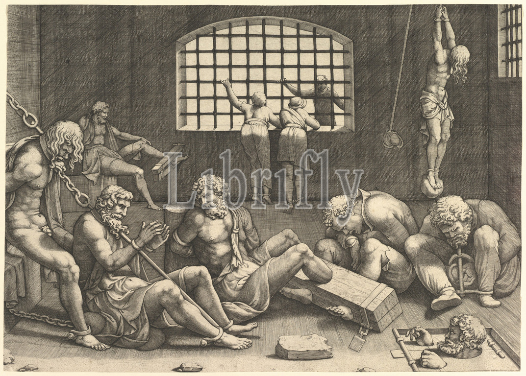 Prison, group, men, dungeon bound, chains, shackles, right, figure hanging, arms, tied, boulder, n.d, Engraving, plate, 10 1/4 x 14 3/16, 26 36 cm, trimmed within borderline, Prints, Anonymous, After Giulio Romano, Italian, Rome, 1499?–1546, Mantua