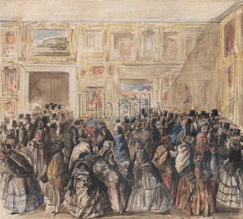 Private View, Royal Academy, William Payne, active 1850s, British, 1858, Watercolor, graphite, pen, black ink, medium, slightly textured, cream wove paper, Sheet, art, coats, crowd, dresses, exhibitions, frames, furnishings, gallery, genre subject, gowns, hats, top, paintings, people, skirts, garments, City, Westminster, Greater London, London, Royal Academy