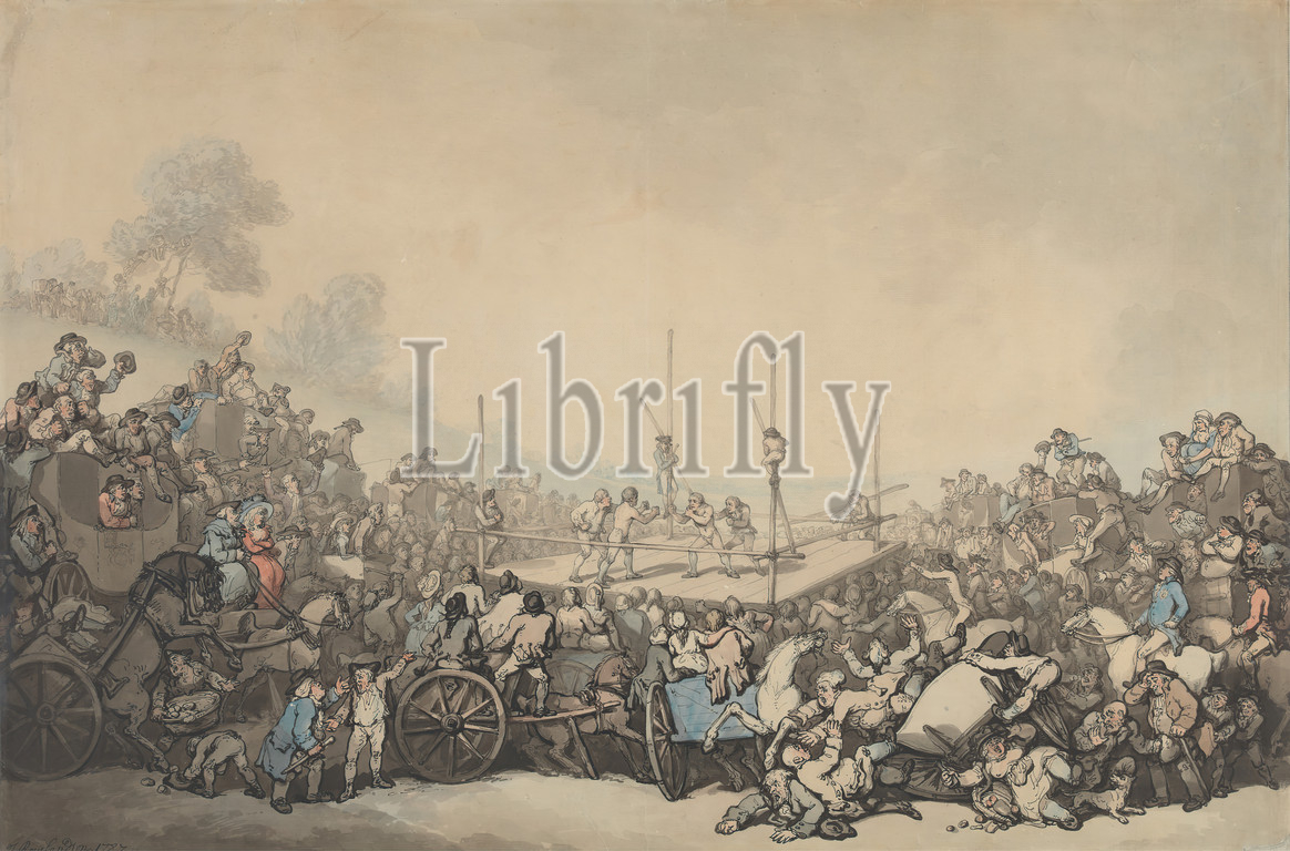 The Prize Fight, Thomas Rowlandson, 1756–1827, British, 1787, Watercolor with pen and black and gray ink over graphite on moderately thick, moderately textured, beige, laid paper, Sheet: 18 1/8 x 27 3/8 inches (46 x 69.5 cm) and Frame: 29 3/4 x 36 1/4 x 1 1/8 inches (75.6 x 92.1 x 2.9 cm), boxes (containers), canes, carriages, collar, crowd, dogs (animals), fighting, horses (animals), men, platform, poles, prize, ring, sporting art, trees, wagons, women