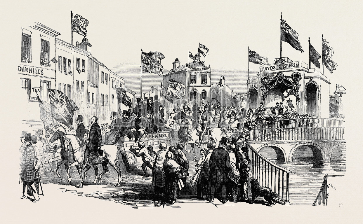 procession, high sheriff, lancashire, rochdale, 1850 engraving, engraved image, history, illustrative technique, engravement, victorian, arts, culture, retro styled, vintage, retro, arkheia